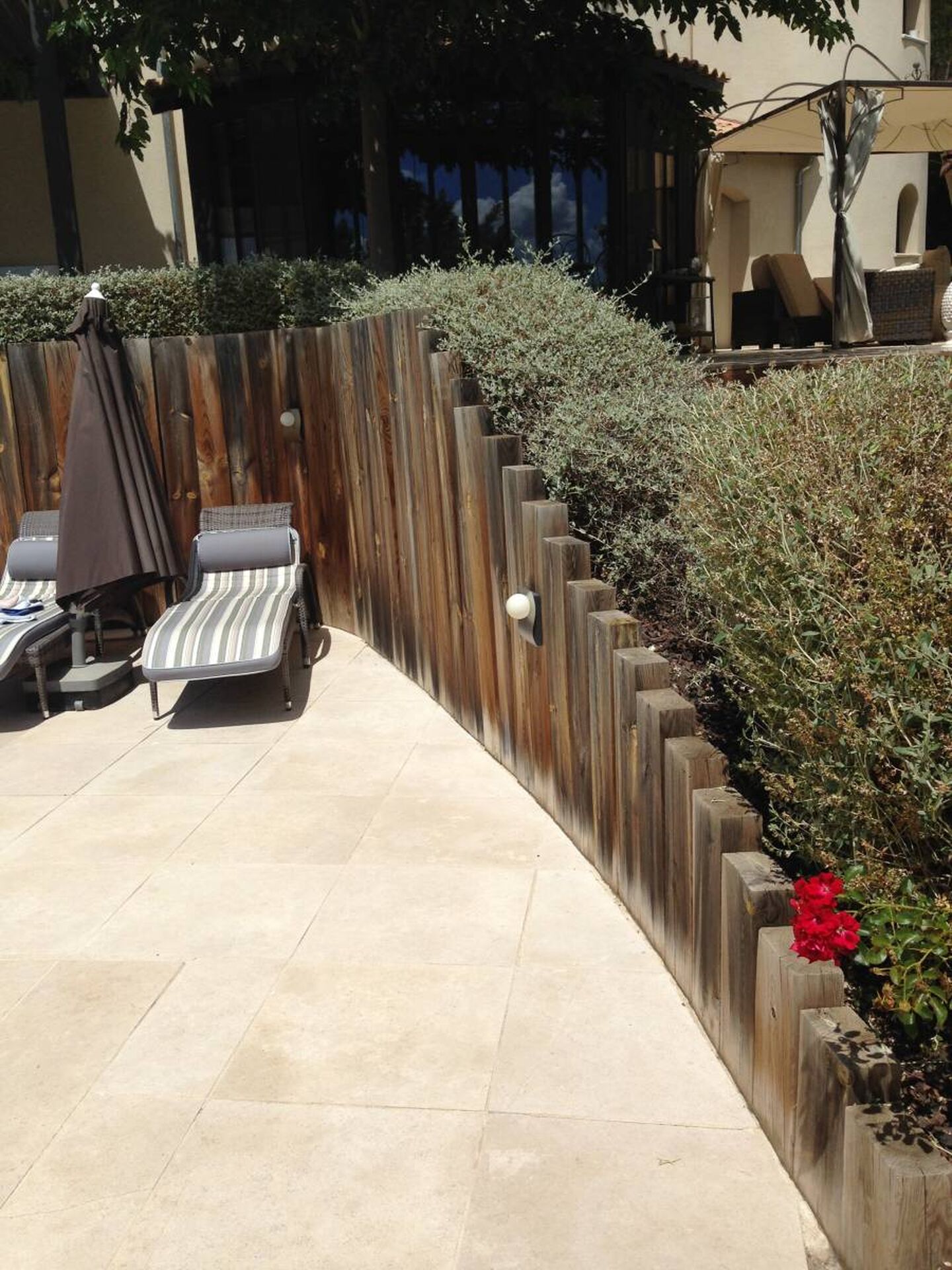 Nous avons délimité les différentes zones du jardin avec la pose de bordures et de murs en bois.
