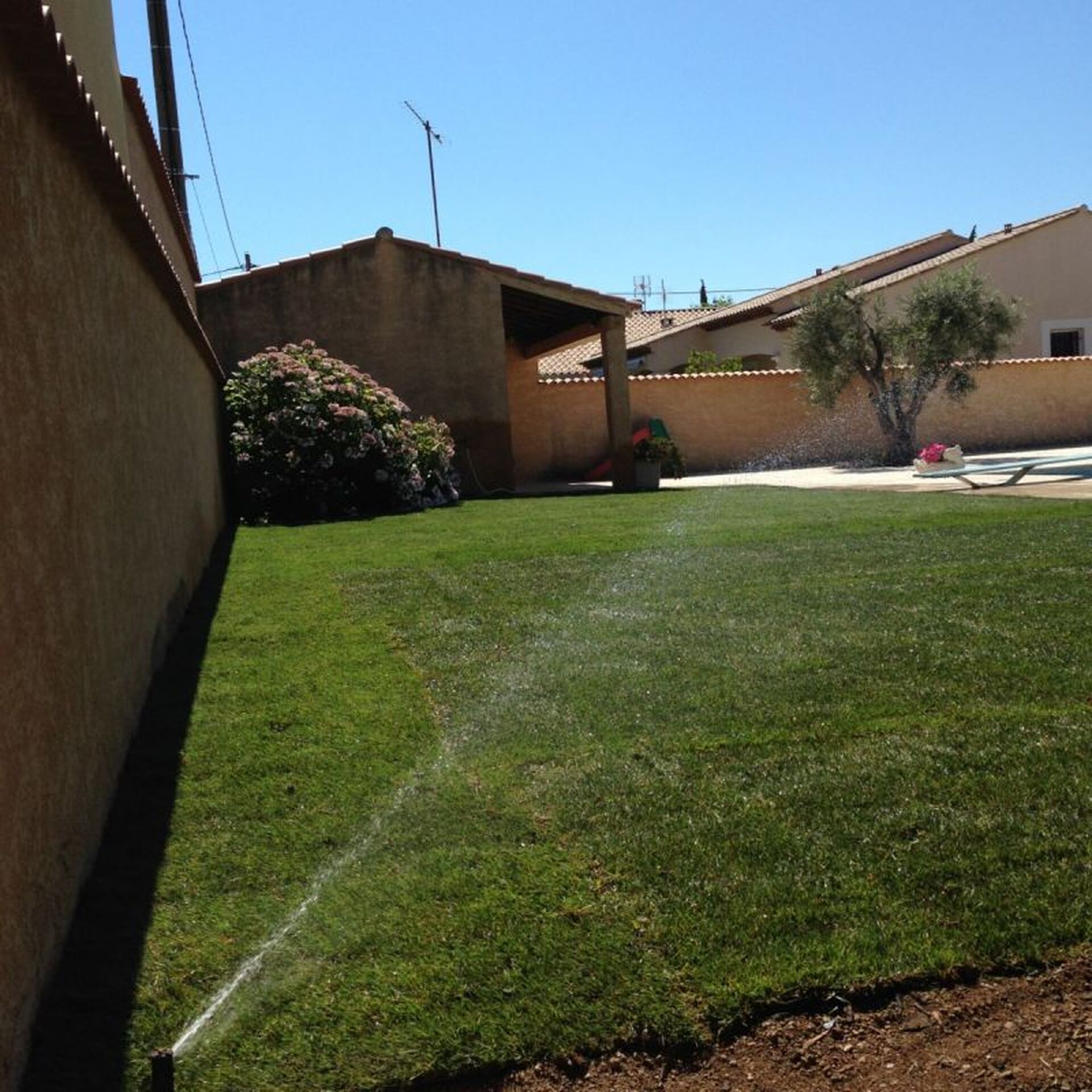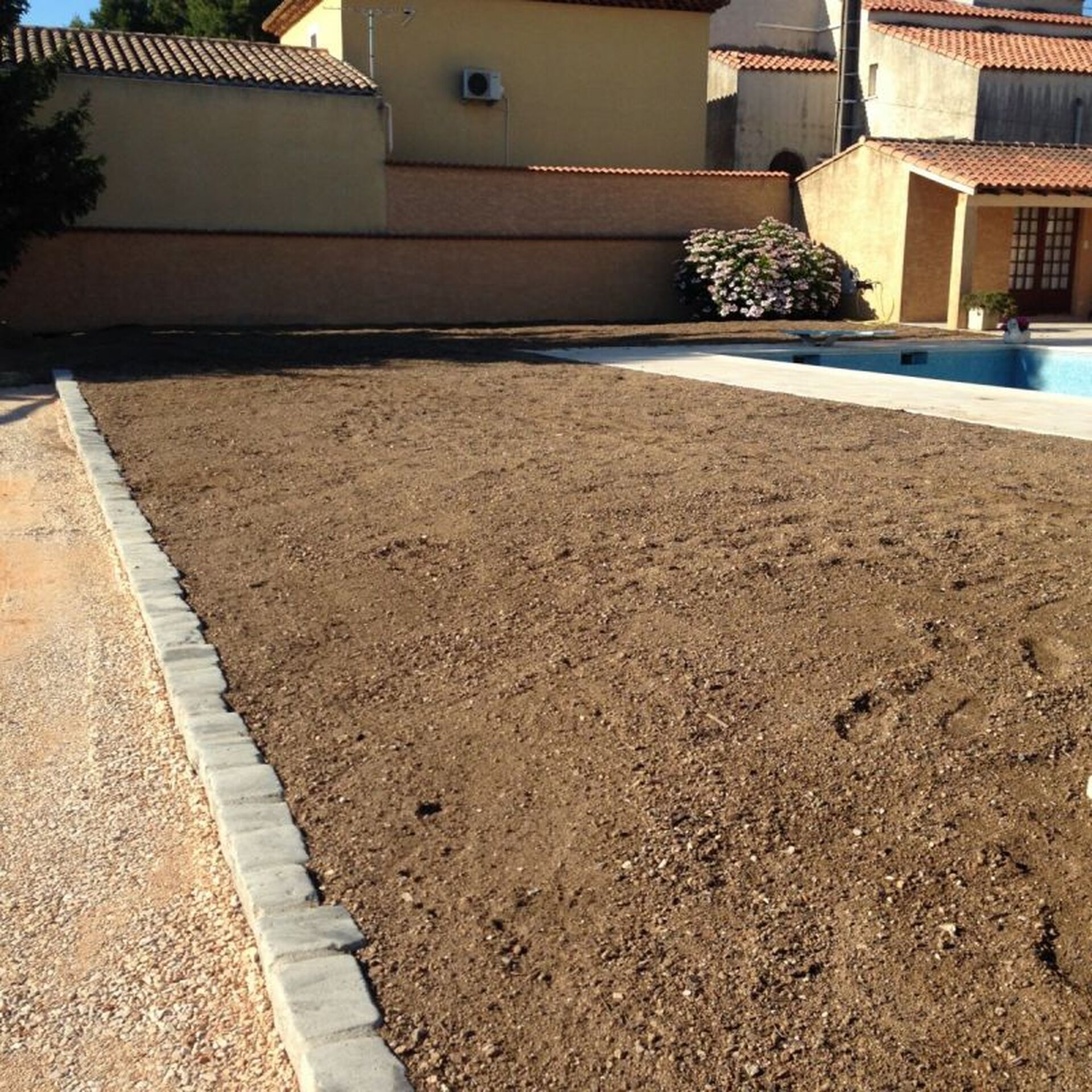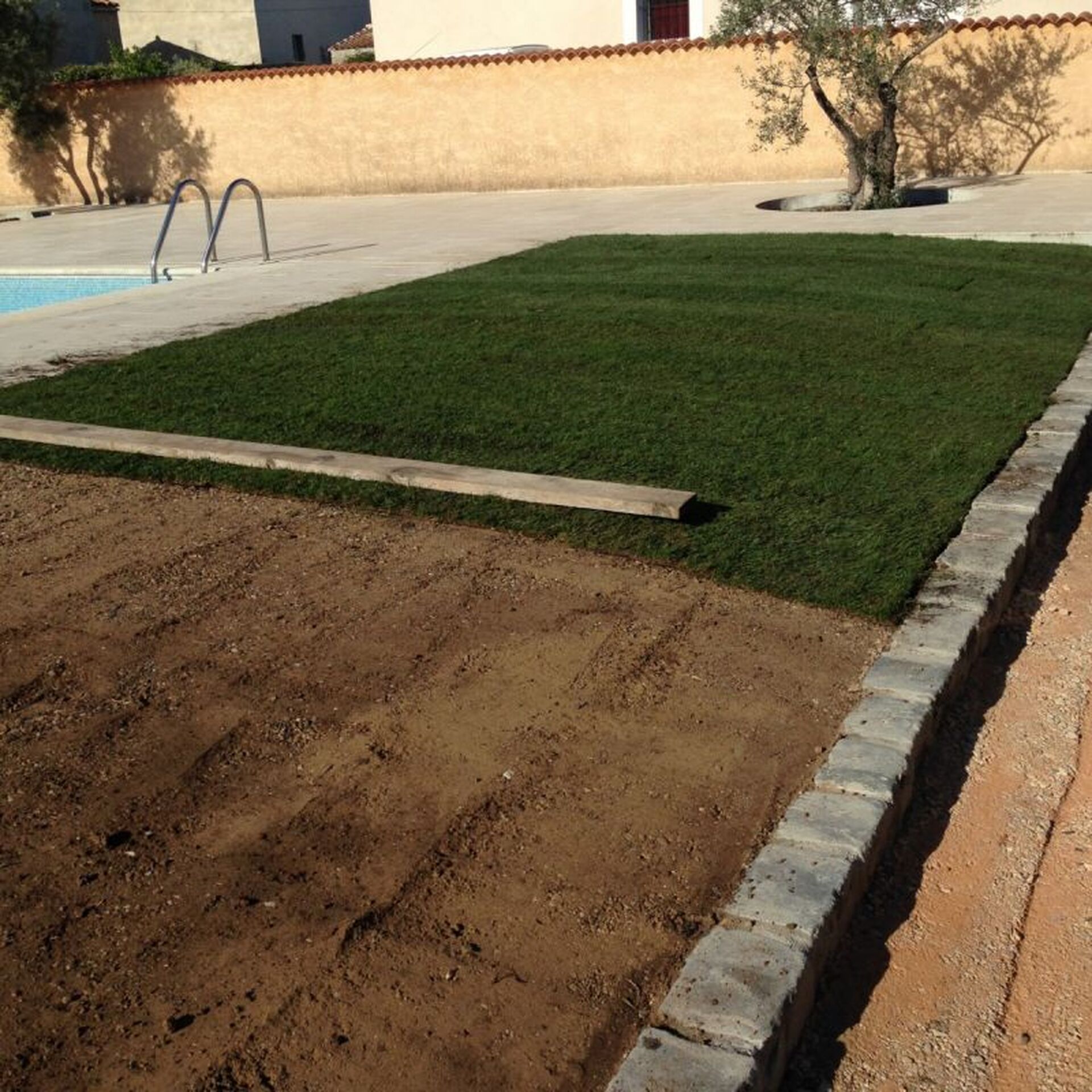 sur gignac nous avons réalisé l'amenagement d'une piscine comprenant le terrassement, la mise en place de pavé de marseille en guise de bordure, l'arrosage automatique, un apport de terre végetale enrichie et la pose d'un gazon en plaque