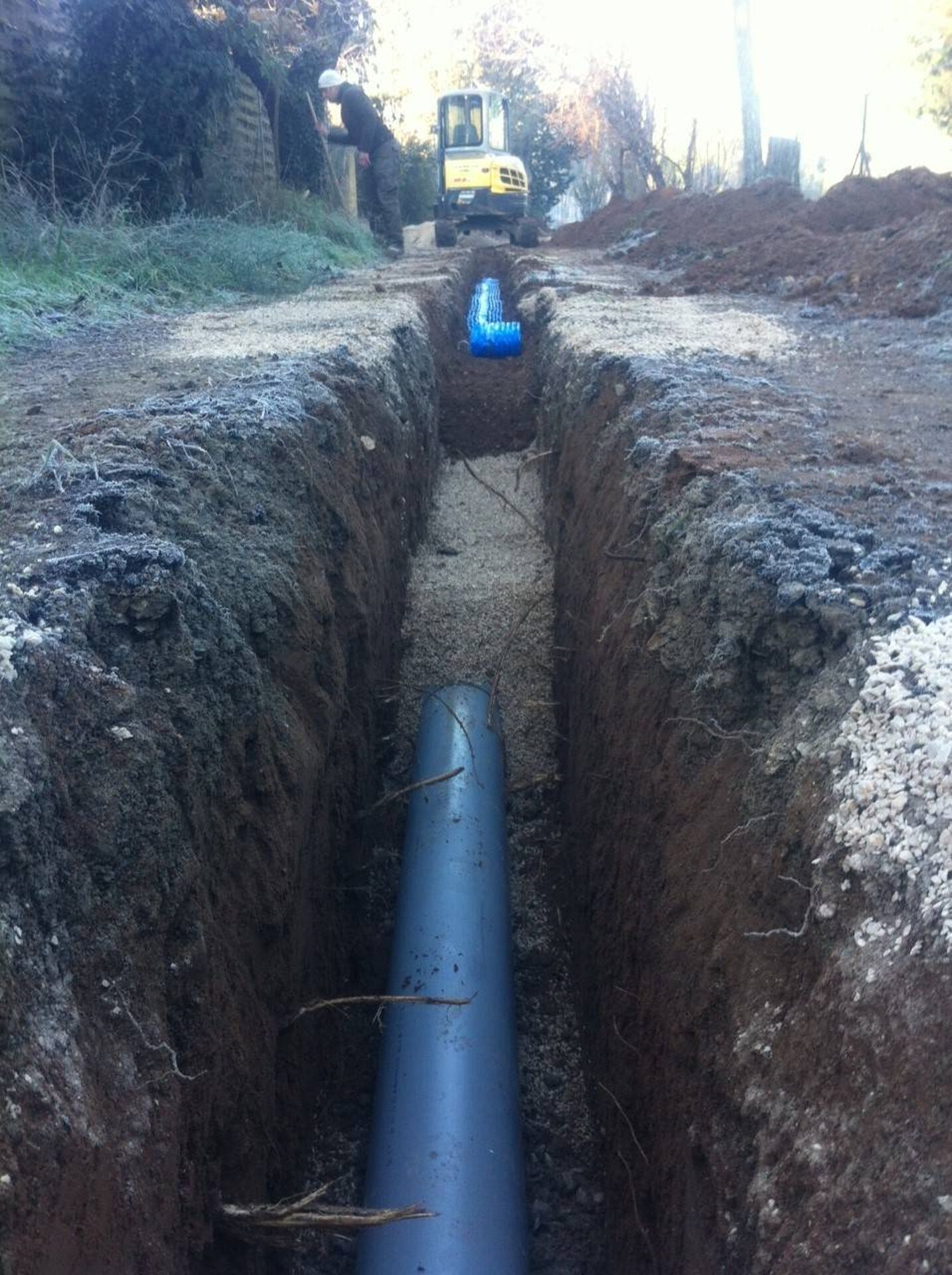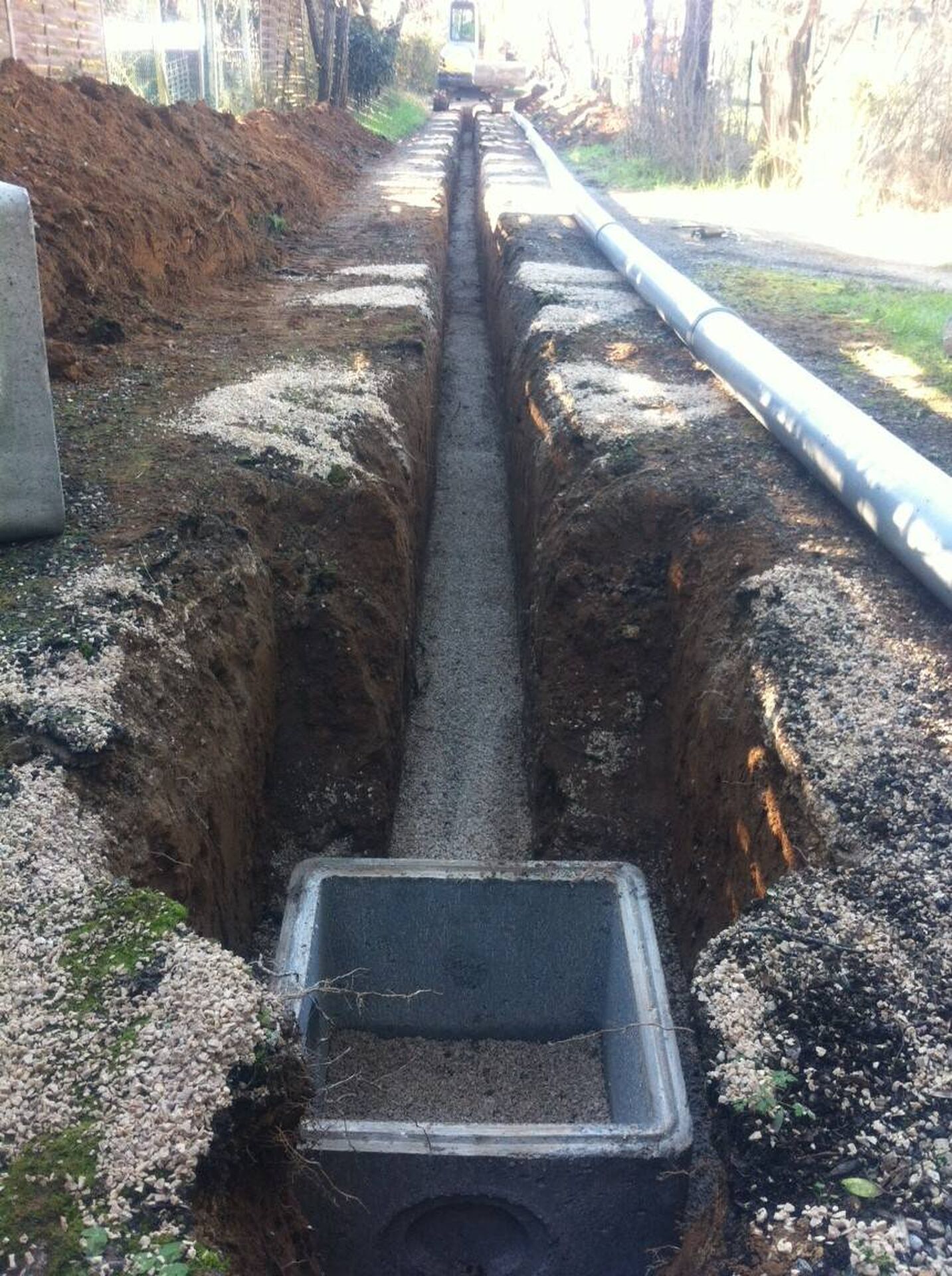 Par la suite, des regards sont placés à intervalles réguliers et les tuyaux sont mis en place et collés. Une fois cette opération réalisée, nous posons une couche de 20 cm de sable ainsi qu'un grillage avertisseur et nous remblayons.