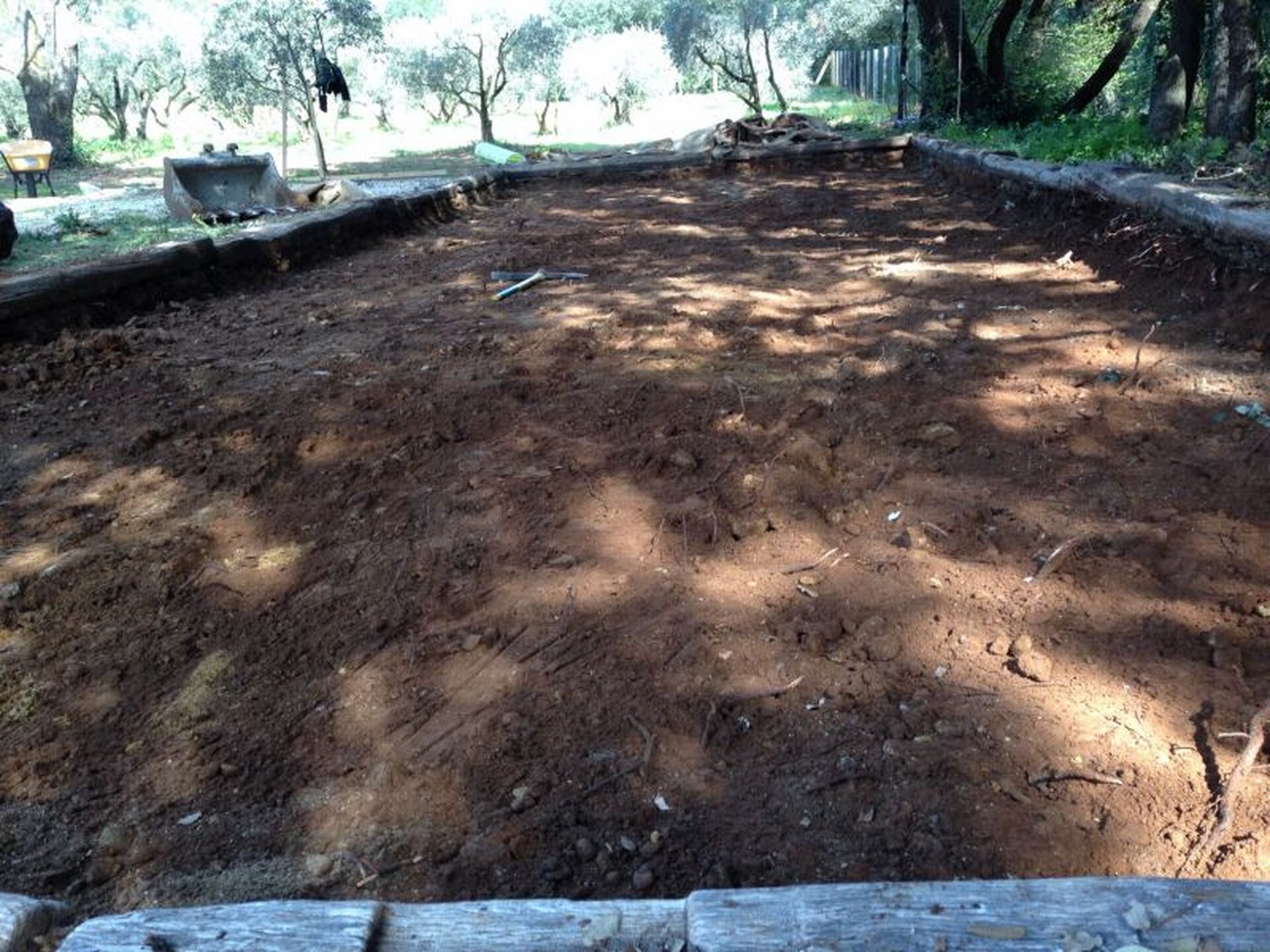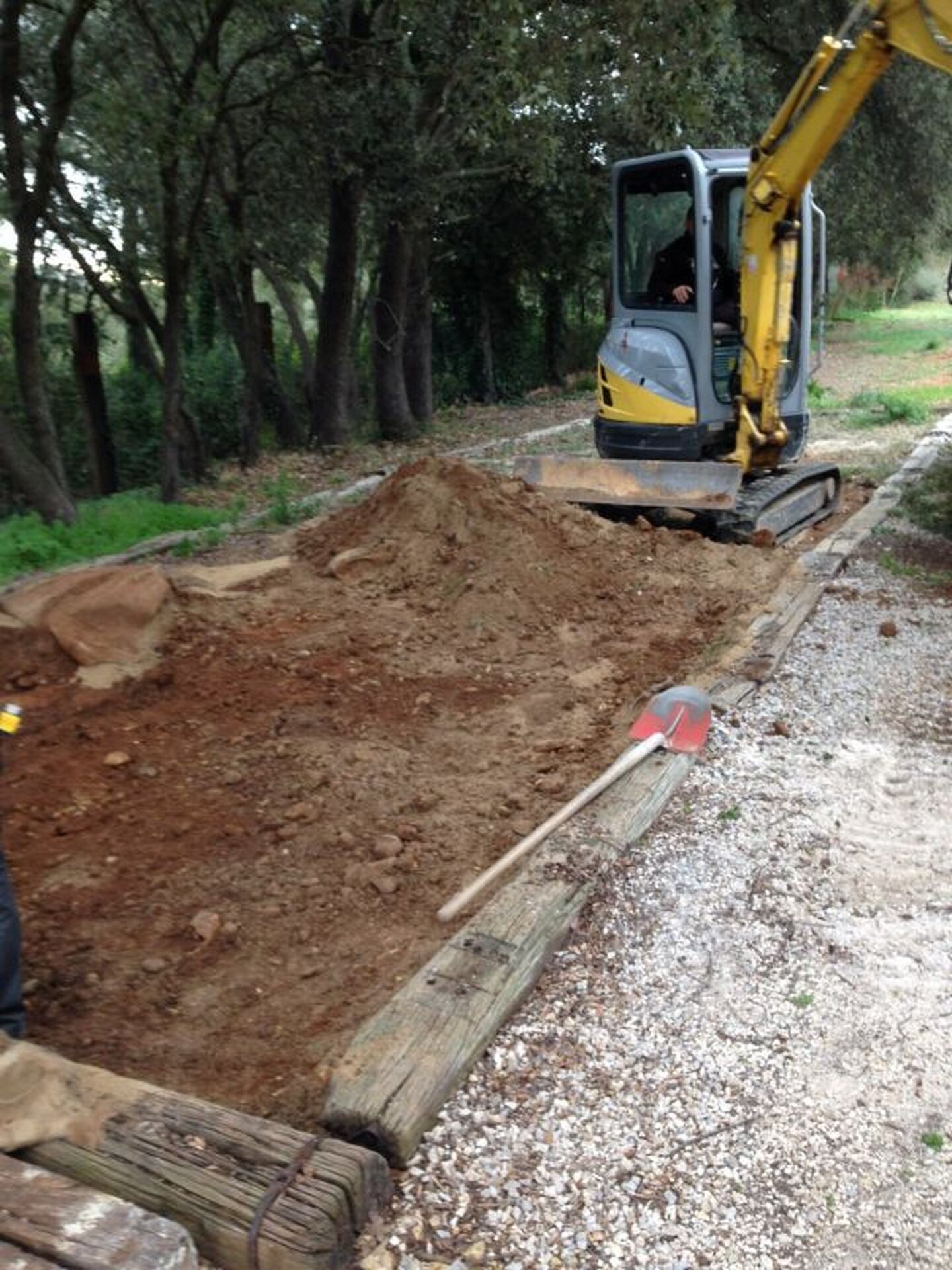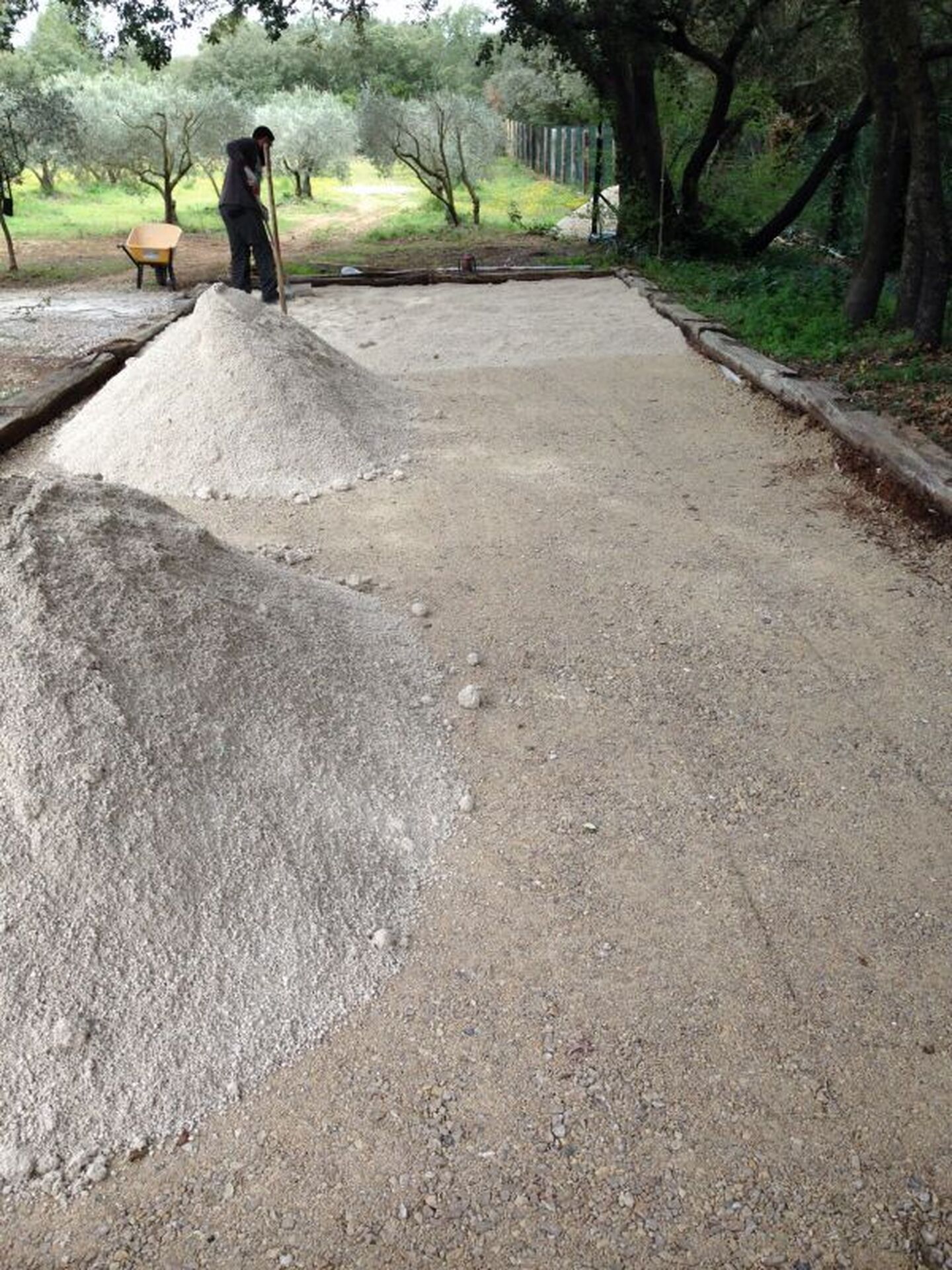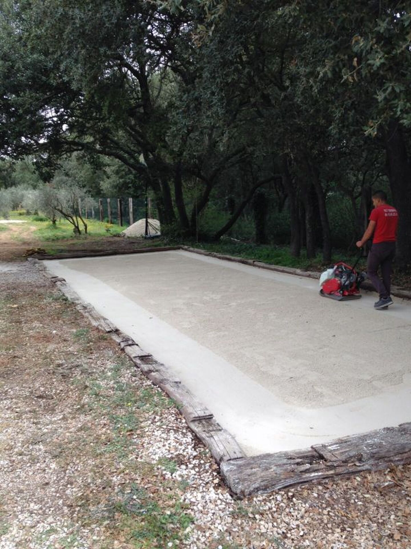 Pour notre client à grans, nous avons décaissé et évacué la terre, ensuite nous avons mis un géotextile et 20cm de tout venant que nous avons roulé et compacté pour finir avec 6cm de sable stabilisé que nous avons reglé et compacté. Des poutres en chene viennent entourer le terrain de boule